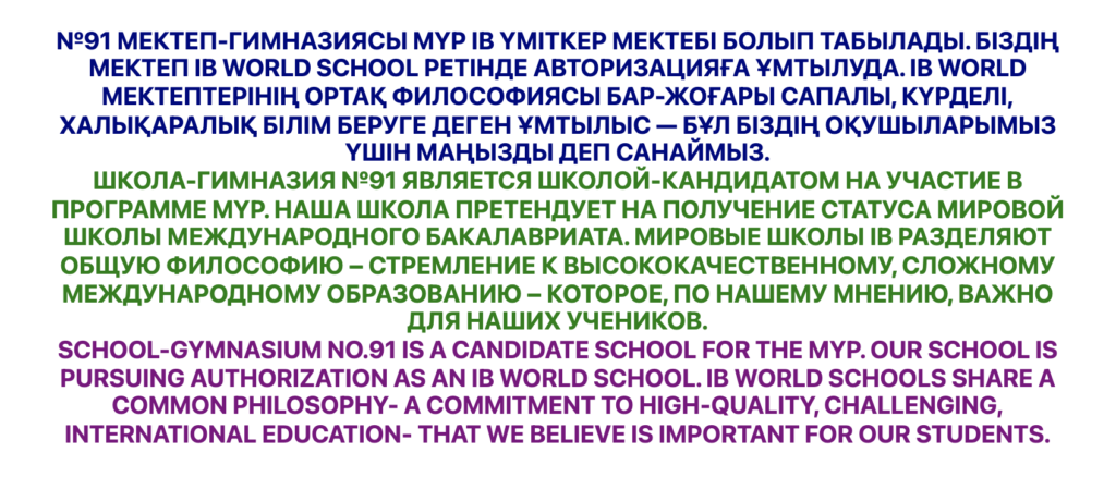 №91 мектеп-гимназияның миссиясы: «БІЗ ҚАУІПСІЗ ҚОҒАМДАСТЫҚ ҚҰРУҒА ҰМТЫЛАТЫН, ҰЛТАРАЛЫҚ ОЙЛАУ ҚАБІЛЕТІ БАР ӘЛЕМ АЗАМАТТАРЫН ТӘРБИЕЛЕЙМІЗ». Миссия школы-гимназии №91: «МЫ ВОСПИТЫВАЕМ ГРАЖДАН МИРА С ИНТЕРНАЦИОНАЛЬНЫМ МЫШЛЕНИЕМ, СТРЕМЯЩИХСЯ К СОЗДАНИЮ БЕЗОПАСНОГО СООБЩЕСТВА». The mission of the school-gymnasium №91 is «WE EDUCATE GLOBAL CITIZENS WITH INTERNATIONAL-MINDEDNESS, STRIVING TO CREATE A SAFE COMMUNITY».