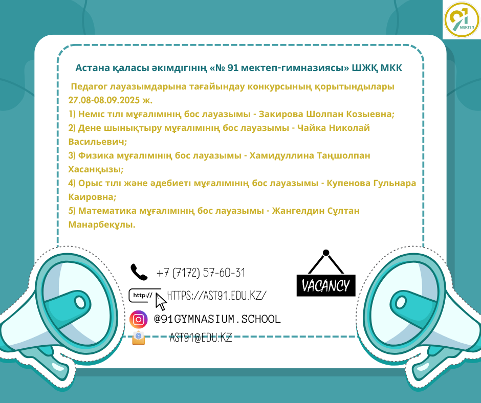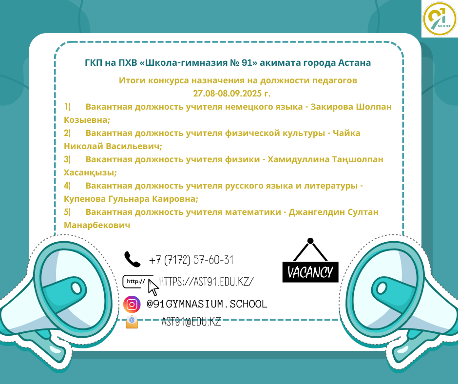 Перечень документов_рус. 1. Объявляется конкурс на занятие вакантных должностей 9.12.2021г 1. Шешімі №01 31.12.2021ж. 2. Объявляется конкурс на занятие вакантных должностей 22.12.2021г 2. Шешімі №01 17.01.2022ж. 3. Объявляется конкурс на занятие вакантных должностей 05.01.2022г 3. Шешімі №02 26.01.2022ж. 4. Объявляется конкурс на занятие вакантных должностей 07.01.2022г 4. Шешімі №03 31.01.2022ж. 5. Объявляется конкурс на занятие вакантных должностей 04.02.2022г 5. Шешімі №04 28.02.2022ж. 6.Объявляется конкурс на занятие вакантных должностей 16.02.2022г 6. Шешімі №05 09.03.2022ж. 7. Объявляется конкурс на занятие вакантных должностей 14.04.2022г 7. Шешімі №06 06.05.2022ж. 8. Объявляется конкурс на занятие вакантных должностей 16.06.2022г 9. Объявляется конкурс на занятие вакантных должностей 16.06.2022г Перечень документов_каз,рус. 10.Объявляется конкурс на должность водителя- 01.08.22г 11.Объявляется конкурс на занятие вакантных должностей предм.каз,рус. — 04.08.2022г. 12.Объявляется конкурс на занятие вакантных должностей — 04.08.2022г. 13.Шешімі №8 19.08.2022ж 14. Объявляется конкурс на занятие вакантных должностей — предм.каз,рус. — 23.08.2022г. 15. Объявляется конкурс на занятие вакантной должности — 23.08.2022г. 16. Объявляется конкурс на занятие вакантных должностей — предм.каз,рус. — 23.08.2022г. 17. Шешімі №9 от 09.09.2022 18. Объявляется конкурс на занятие вакантных должностей предм.каз,рус. — 27.09.2022г.-05.10.2022г. предм. 19. Объявляется конкурс на занятие вакантных должностей 27.09.2022г.-05.10.2022г дефектолог 20. Объявляется конкурс на занятие вакантных должностей 27.09.2022г.-05.10.2022 пед.-ассистент Шешімі №10 от 07.10.2022 22.Объявление о проведении Конкурс 01.11.2022г.-09.11.2022г дефектолог 23.Объявление о проведении Конкурс — 01.11.2022г.-09.11.2022г. 24.Объявление о проведении Конкурс 01.11.2022г.-09.11.2022г. педагог-ассистент 25.Шешімі №11 от 11.11.2022г Перечень документов каз,рус. — 15.11.2022г. 26.Объявление о проведении Конкурс 15.11.2022г.-23.11.2022г. педагог-ассистент 27. Объявление о проведении Конкурс предм.каз,рус.15-23.11.2022г. 29.Объявление о проведении Конкурс — 15.11.2022г.-23.11.2022г. 30.№12 шешім от 25.11.2022г. 31. Объявление-о-проведении-Конкурс-01.12.2022г.-09.12.2022г. 32. Объявление-о-проведении-Конкурс-14.12.2022г.-23.12.2022г. 33. Объявление о проведении Конкурс — 14.12.2022г.-23.12.2022г. 34. ШЕШІМІ №13 — 15.12.2022ж 35. Шешімі №14-27.12.2022 35. Объявление-о-проведении-Конкурс-28.12.2022г.-09.01.2023г. Шешімі №1 11.01.2023 Шешімі №2 11.01.2023 36.Объявление-о-проведении-Конкурс-29.12.2022г.-10.01.2023г. 37. Объявление-о-проведении-Конкурс-29.12.2022г.-10.01.2023г. ШЕШІМІ №3 11.01.2023 Перечень документов каз,рус.2023г. 38. Объявление о проведении Конкурс — 17.01.2023г.-25.01.2023г. социальный педагог 39.Объявление-о-проведении-Конкурс-17.01.2023г.-25.01.2023г. воспитатель, пед.-ассистент, математика, пед.-дефектолог 40.Объявление-о-проведении-Конкурс-16.01.2023г.-24.01.2023г. русский язык 41.Объявление-о-проведении-Конкурс-17.01.2023г.-25.01.2023г. казахский язык 42.Объявление-о-проведении-Конкурс-17.01.2023г.-25.01.2023г. вожатый Шешімі №4 27.01.2023 43 Объявление о проведении Конкурс — 31.01.2023г.-08.02.2023г. социальный педагог 44 Объявление о проведении-Конкурс-31.01.2023г.-02.02.2023г. учитель нач.кл. 45 Объявление-о-проведении-Конкурс-31.01.2023г.-08.02.2023г. вожатый 46 Объявление-о-проведении-Конкурс-31.01.2023г.-08.02.2023г. воспитатель, пед.-ассистент, математика, пед.-дефектолог 47-Объявление-о-проведении-Конкурс-31.01.2023г.-08.02.2023г.-русский язык 48.Объявление-о-проведении-Конкурс-09.02.2022г.-17.02.2023г. АӘД Шешімі №5 15.02.2023 49.Объявление о проведении-Конкурс-23.02.2023г.-03.03.2023г. учитель нач.кл. шешімі №6 50.Объявление-о-проведении-Конку